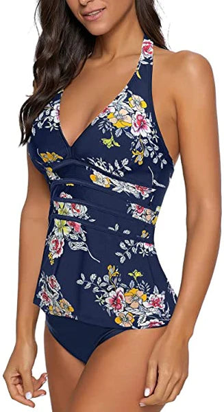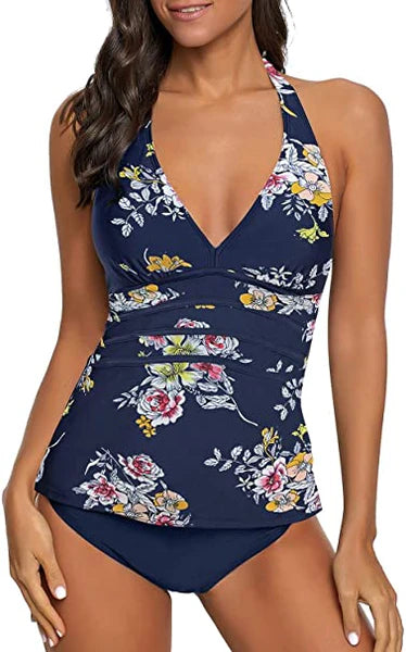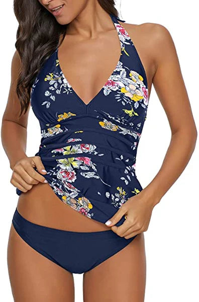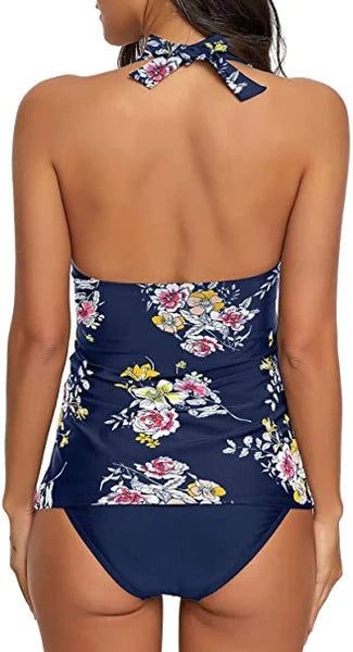 Traje de baño de dos piezas tipo tankini, diseñado para brindar comodidad y estilo. El top con tirantes ajustables y detalle en el cuello halter realza la figura, mientras que su corte largo ofrece mayor cobertura. La parte inferior clásica complementa el conjunto, creando un balance perfecto entre elegancia y frescura. Ideal para disfrutar de la playa o la alberca con seguridad y confianza.