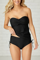Tankini con diseño bandeau que combina elegancia y comodidad. Su parte superior cuenta con drapeado frontal que favorece la figura y tirantes removibles para mayor versatilidad. Los laterales ajustables permiten personalizar el largo, brindando un ajuste perfecto. Ideal para disfrutar con confianza en la playa o la alberca.