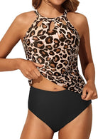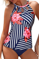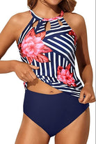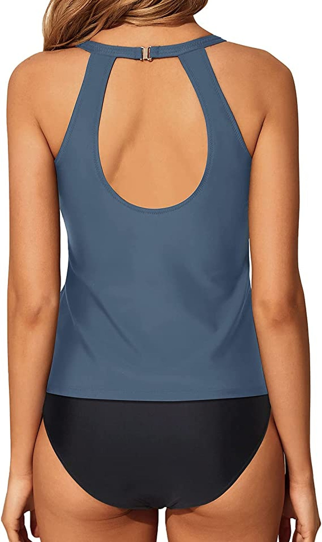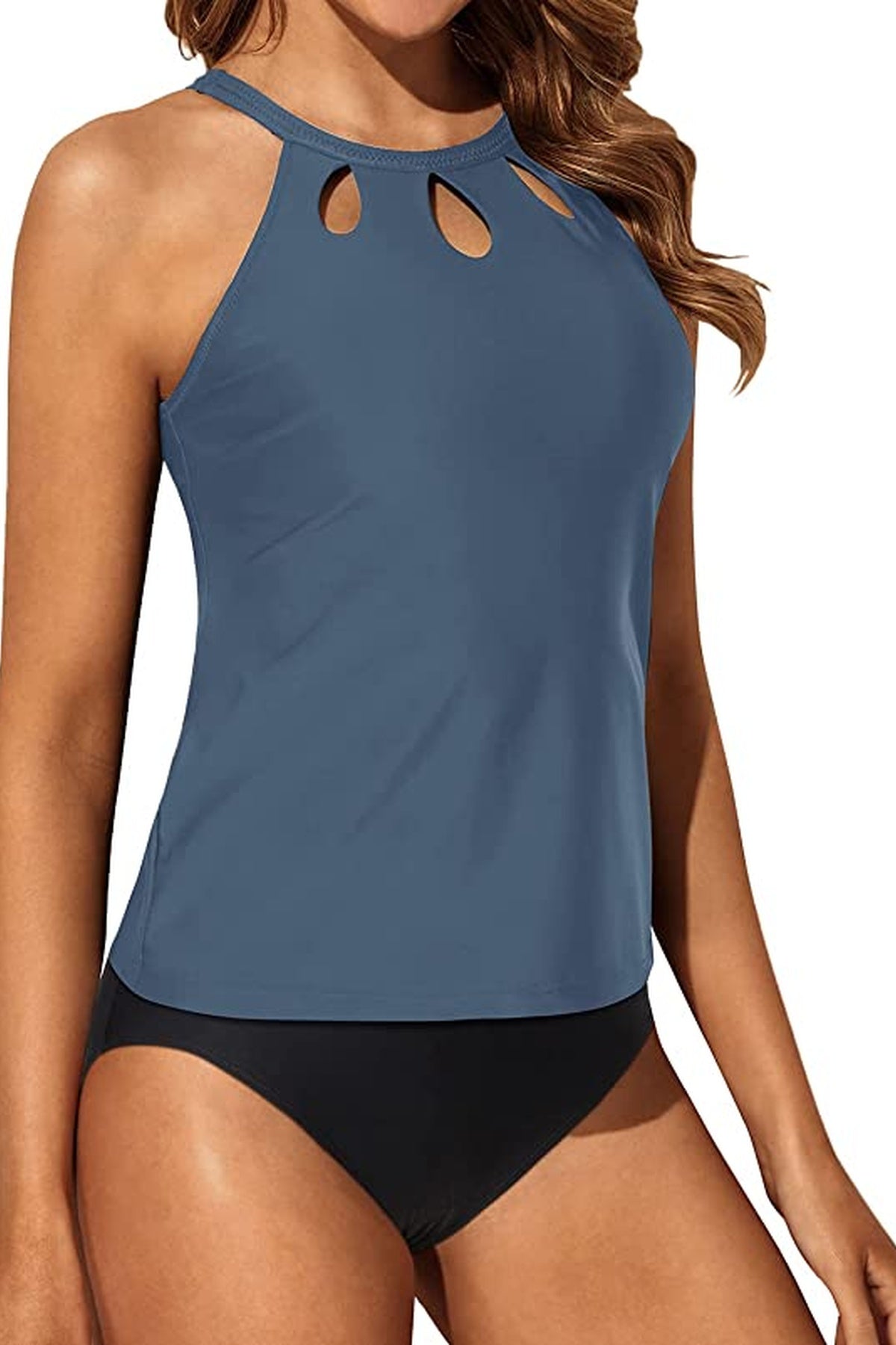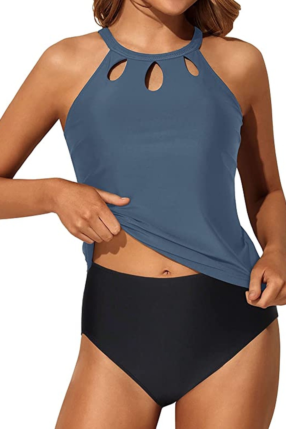 Traje de baño tankini de dos piezas con top de escote alto y modernos recortes frontales que aportan un detalle elegante y juvenil. La espalda cuenta con diseño abierto y cierre en el cuello para un ajuste cómodo. La parte inferior de corte clásico complementa el conjunto, ideal para disfrutar con confianza y estilo en la playa o la alberca.