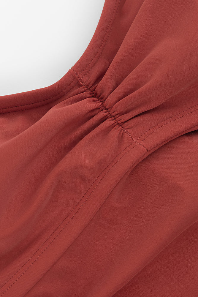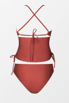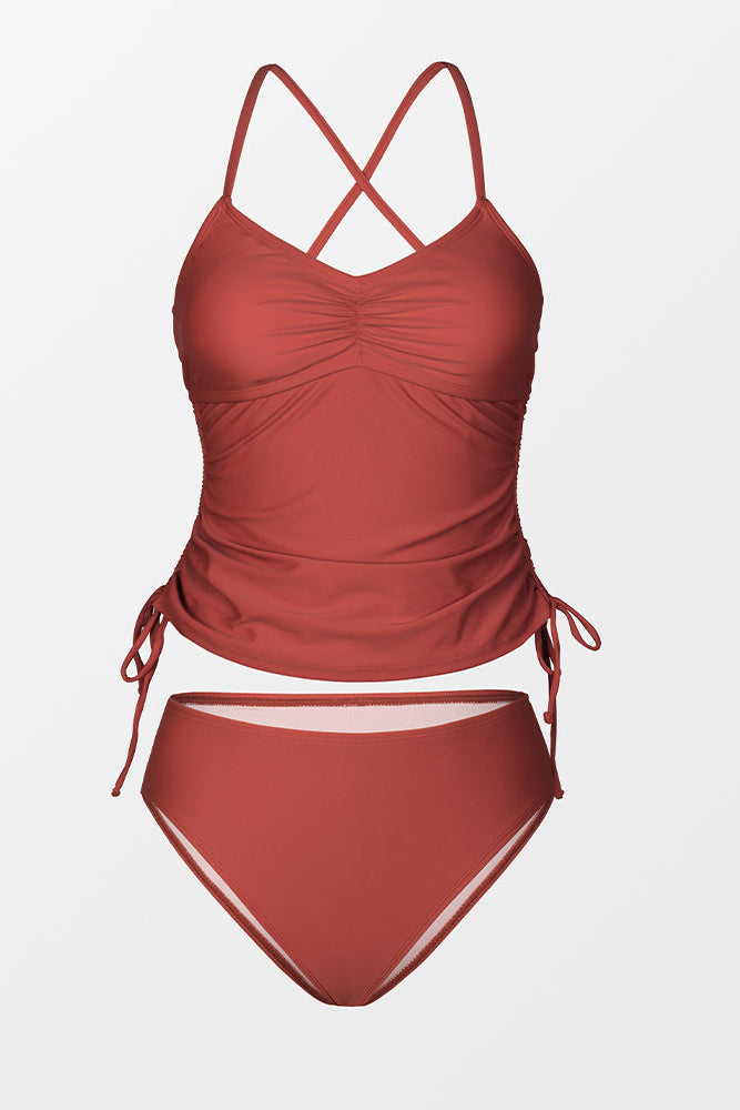 Traje de baño de dos piezas con diseño tipo tankini que ofrece un ajuste cómodo y favorecedor. La parte superior cuenta con detalle fruncido al frente y tirantes cruzados en la espalda que brindan soporte y un look estilizado. Los costados ajustables permiten adaptar el largo a tu preferencia, asegurando mayor comodidad y libertad de movimiento. El bottom de tiro medio complementa el conjunto con un ajuste suave y seguro. Una opción ideal para disfrutar con confianza y estilo en cada momento.