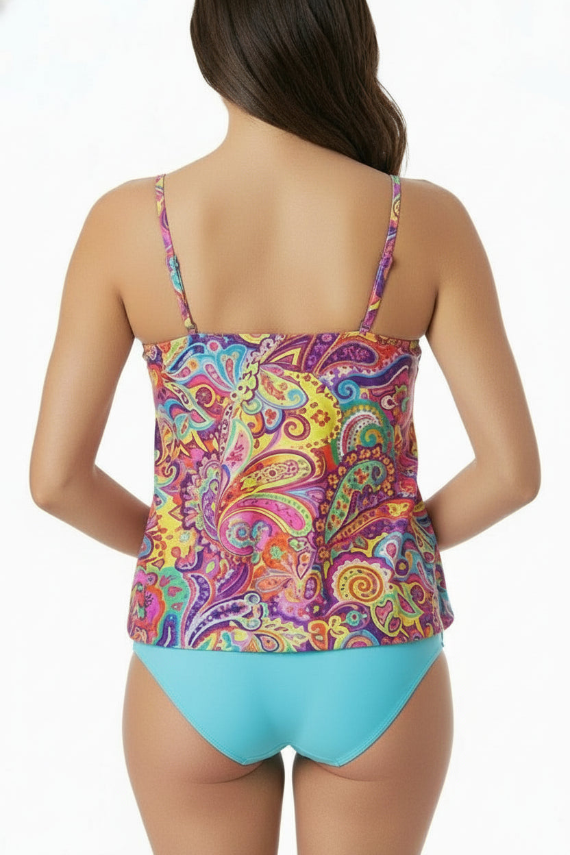 Traje de baño tipo tankini con blusa holgada y bottom cómodo. Diseño favorecedor, con caída ligera y ajuste suave en la parte baja para mayor libertad de movimiento. Perfecto para quienes buscan cobertura cómoda y un estilo moderno para disfrutar del agua con confianza.