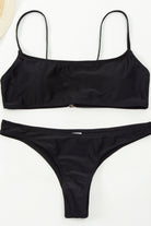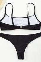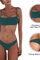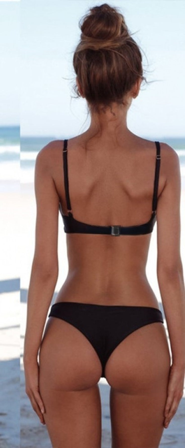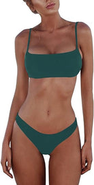 Bikini brasileño con diseño sencillo y moderno. El top de tirantes delgados y escote recto ofrece un ajuste cómodo con cierre en la espalda, mientras que la parte inferior de corte alto estiliza la figura. Su diseño posterior tipo brasileño resalta las curvas con un look fresco y llamativo, perfecto para brillar en la playa o la alberca.
