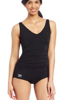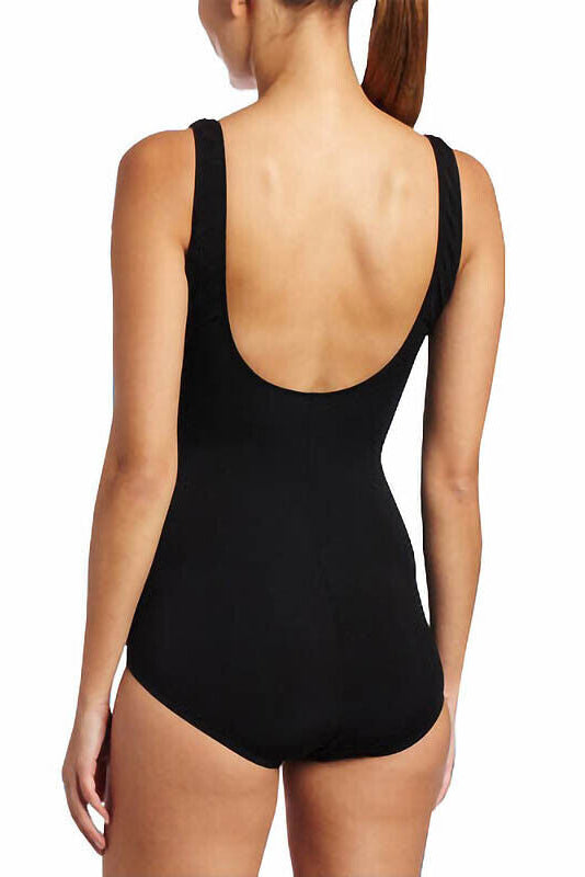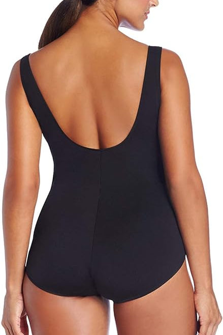 Traje de baño de una pieza con escote en V y diseño clásico que ofrece máxima comodidad y soporte. Su corte con fruncido frontal ayuda a estilizar la silueta, mientras que la espalda abierta aporta un toque elegante. Ideal para quienes buscan un estilo atemporal, cómodo y favorecedor.
