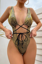 Traje de baño de una pieza con diseño audaz y moderno que realza la figura con un toque de brillo y elegancia. Su escote profundo y tiras ajustables al frente crean un efecto visual estilizado, mientras que los cortes laterales aportan una silueta atractiva y favorecedora. Perfecto para destacar en la playa o la alberca con estilo y confianza.