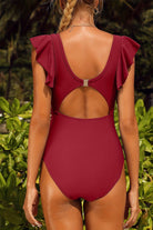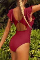 Traje de baño de una pieza con escote en U y delicado detalle de abertura frontal bajo el busto que aporta un toque moderno y femenino. Sus tirantes anchos con volantes añaden un aire romántico y elegante, mientras que los fruncidos laterales ayudan a estilizar la figura. En la parte trasera, cuenta con un cierre de broche y corte con abertura que equilibra soporte y estilo. Ideal para lucir sofisticada y segura en cada momento de playa o alberca.