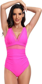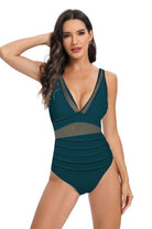 Traje de baño de una pieza con escote en V profundo y transparencias estratégicas que estilizan la silueta. Incorpora drapeados en la zona abdominal que aportan un efecto visual de control sin perder comodidad. Sus tirantes anchos brindan soporte y seguridad, mientras que el diseño elegante lo convierte en una opción versátil para lucir con confianza en cualquier ocasión de playa o alberca.