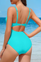 Traje de baño de una pieza con escote en V y delicado cruce frontal que estiliza el busto, acompañado de un detalle cut-out bajo el pecho para un toque moderno. Sus mangas cortas con volantes añaden un aire femenino y elegante, mientras que la espalda profunda realza la silueta con sofisticación. La parte inferior cuenta con efecto fruncido que favorece la figura y aporta comodidad, ideal para lucir segura y con estilo en cada ocasión junto al mar o la alberca.