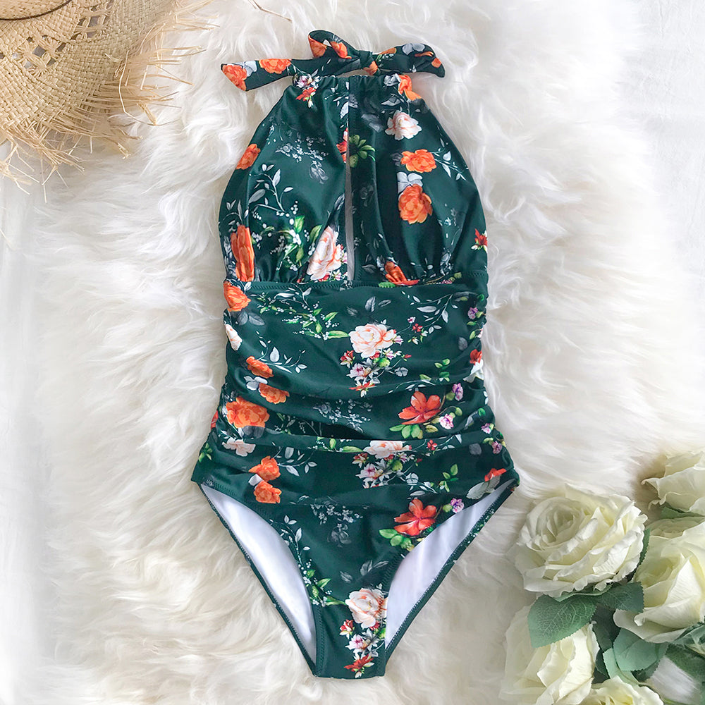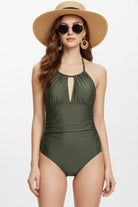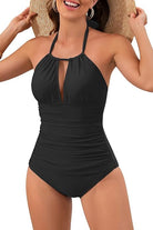 Traje de baño de una pieza con escote halter ajustable que realza la silueta con elegancia. Su diseño con drapeado frontal ayuda a estilizar visualmente la figura y ofrece una sujeción cómoda sin perder movilidad. Perfecto para quienes buscan una prenda sofisticada, moderna y con un toque femenino para disfrutar del sol o la alberca.