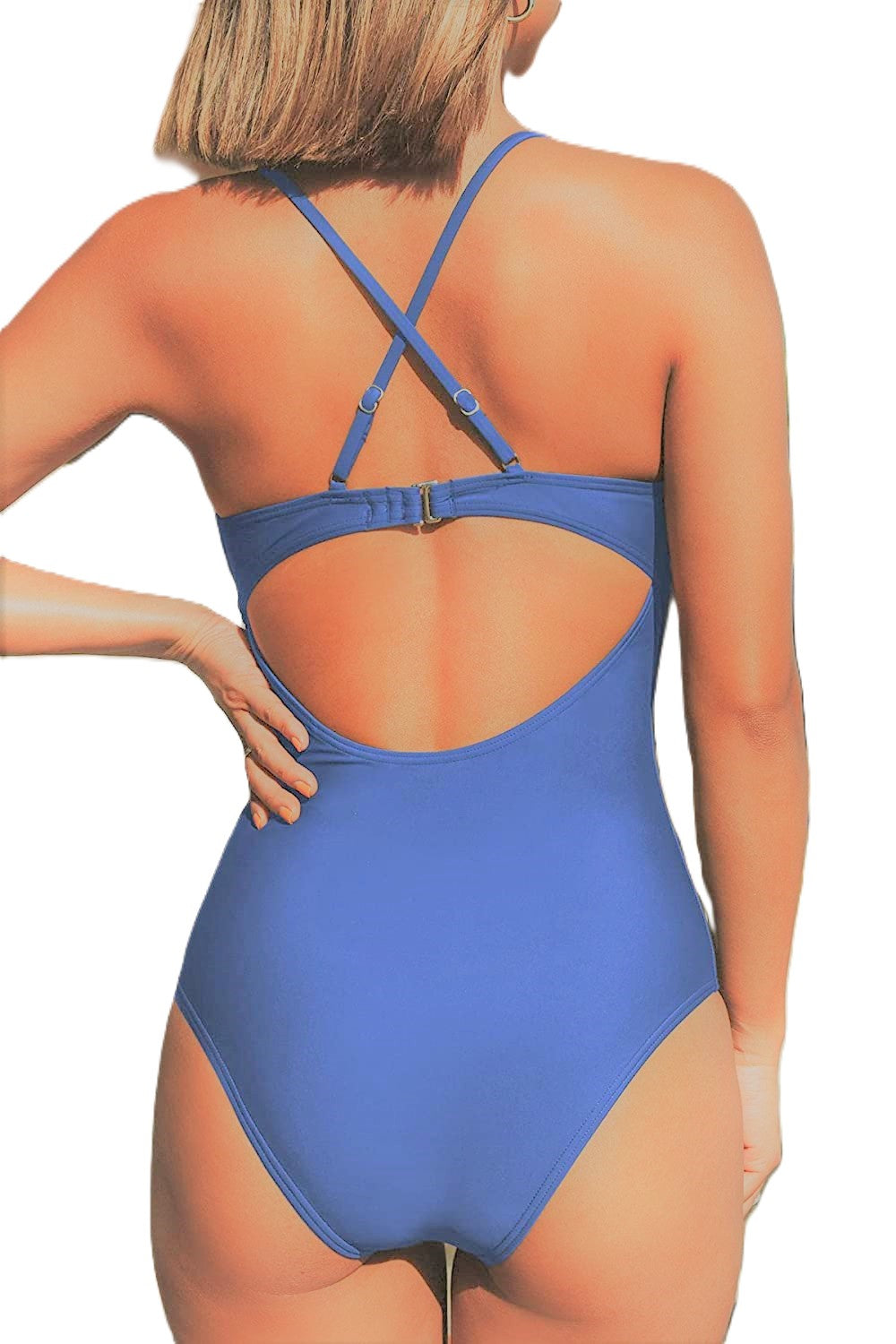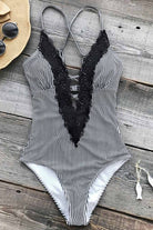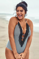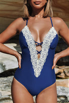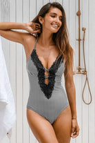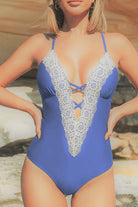 Traje de baño de una pieza con escote profundo en V adornado con delicado encaje que aporta un estilo bohemio y femenino. Su diseño con tirantes ajustables cruzados en la espalda brinda soporte y un ajuste cómodo, mientras que el detalle de abertura en la parte trasera añade un toque moderno y atractivo. Ideal para disfrutar con estilo en la playa o la alberca.