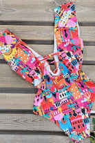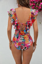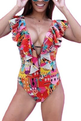 Traje de baño de una pieza con escote profundo y volantes que aportan movimiento y un estilo romántico. Su diseño con espalda descubierta y detalle de moño ajustable combina feminidad y soporte. La tela suave se adapta al cuerpo brindando comodidad y una silueta favorecedora.