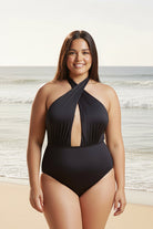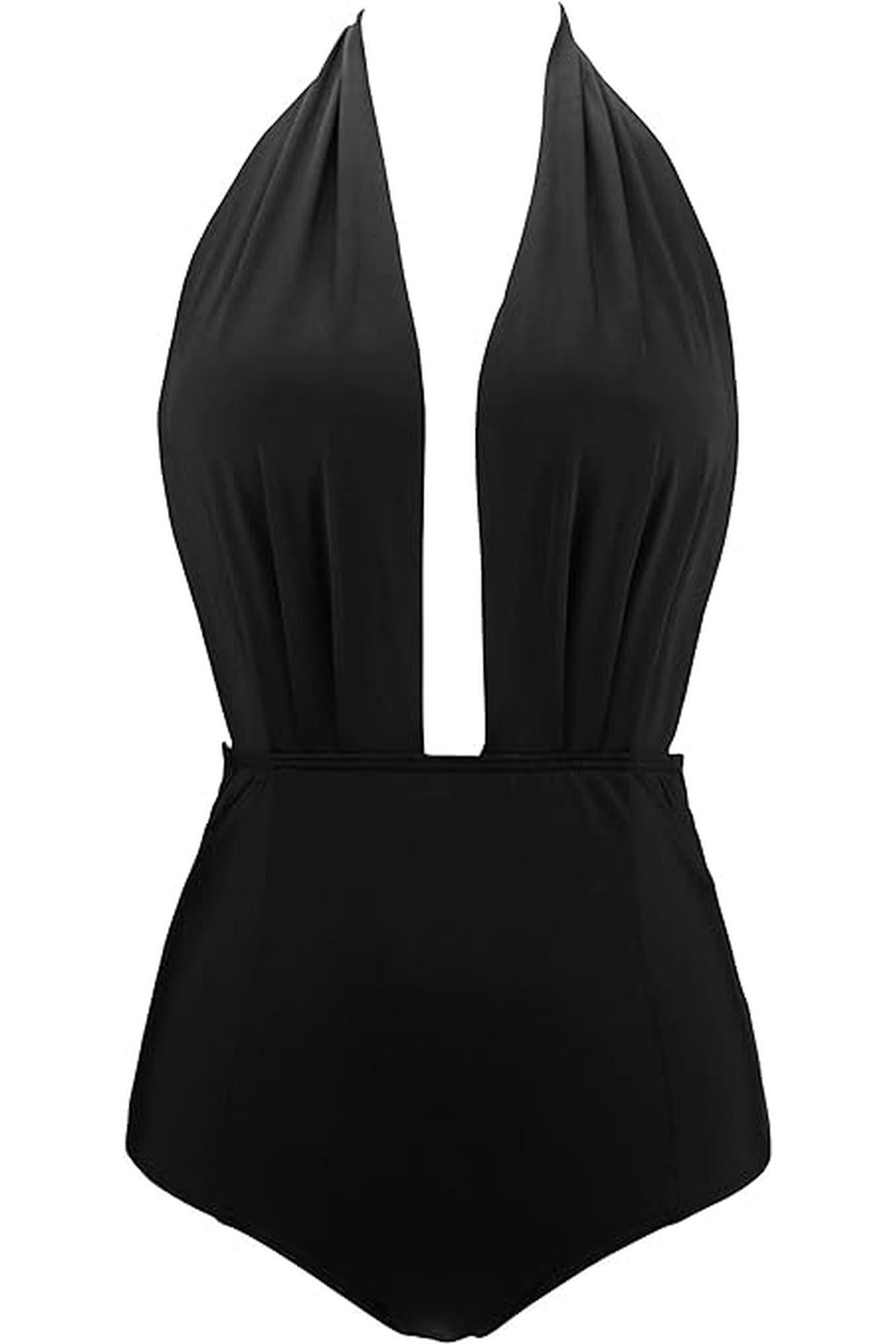 Traje de baño de una pieza con escote profundo en V y amarre al cuello tipo halter con espalda descubierta y corte moderno, es ideal para lucir con elegancia y seguridad en la playa o la alberca.