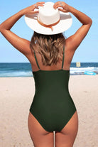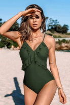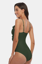 Traje de baño de una pieza con escote cruzado y delicados volantes que aportan un toque romántico y femenino. Sus tirantes delgados ajustables permiten un calce perfecto, mientras que el diseño estiliza la cintura y realza la silueta.