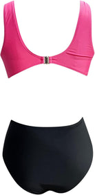 Traje de baño de una pieza con diseño moderno y femenino. Su parte superior de corte alto realza la figura, mientras que el detalle de lazo decorativo en la cintura aporta un toque elegante y favorecedor. El contraste de tonos y el corte estratégico estilizan la silueta, brindando comodidad y estilo para disfrutar del sol con confianza.
