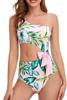 Traje de baño de una pieza con corte asimétrico de un solo hombro y abertura lateral que realza la figura. Su lazo decorativo en la cintura añade un toque femenino y moderno, mientras que el estampado tropical aporta frescura y estilo. Perfecto para disfrutar el sol con comodidad, elegancia y una silueta favorecedora.