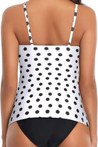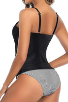 Traje de baño de dos piezas tipo tankini con blusa de tirantes ajustables. El diseño de la parte superior cuenta con fruncidos ligeros en la zona del abdomen que ayudan a estilizar la silueta. La parte inferior es tipo bikini clásico que aporta comodidad y soporte.