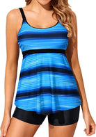 Este tankini combina elegancia y comodidad con su blusa de base azul decorada con rayas negras que aportan un toque moderno y sofisticado. El short en color negro ofrece un ajuste favorecedor, ideal para quienes buscan estilo sin renunciar a la funcionalidad. Perfecto para disfrutar con confianza, este conjunto resalta la silueta mientras brinda comodidad durante todo el día.