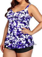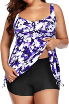 Este tankini short combina una base blanca con elegantes flores en tonos morado, blanco y negro, ofreciendo un diseño sofisticado y fresco. Perfecto para quienes buscan estilo y comodidad en su traje de baño.