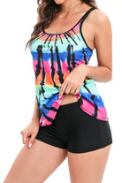 Traje de baño tipo tankini con short negro y blusa estampada en diseño tie-dye multicolor. Su parte superior ofrece un corte suelto que brinda comodidad y libertad de movimiento, al mismo tiempo que estiliza la figura. Ideal para quienes buscan un traje versátil, moderno y práctico para disfrutar de la playa o la alberca.