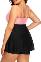 Traje de baño tipo tankini con short integrado y diseño bicolor. La parte superior en tono rosa con escote en V y detalle de moño al frente aporta un estilo femenino y delicado, mientras que la parte inferior en negro ofrece un contraste elegante y favorecedor.