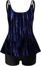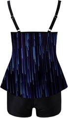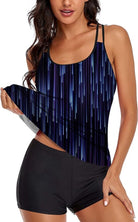 Traje de baño tankini con short en estampado de líneas verticales en tonos azul y negro. Su diseño moderno estiliza la silueta y aporta un efecto visual alargado. Incluye tirantes ajustables para mayor comodidad y soporte, con short negro que brinda seguridad y libertad de movimiento. Ideal para disfrutar de la playa, la alberca o actividades acuáticas con estilo y confort.