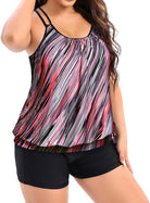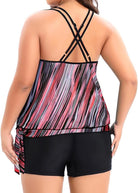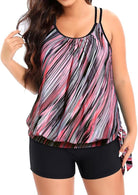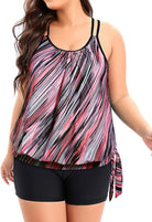 Traje de baño tipo tankini de dos piezas con diseño elegante y favorecedor. La parte superior tiene un estampado de líneas en tonos rosa, negro y blanco, con tirantes delgados dobles que aportan un estilo moderno. El short en color negro sólido brinda comodidad, cobertura y soporte.