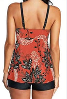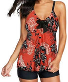 Traje de baño tankini de dos piezas, La blusa roja con estampado floral en negro y blanco cuenta con un lazo decorativo al frente que aporta un detalle femenino y elegante. El short negro proporciona comodidad y seguridad para disfrutar de la playa o la alberca con confianza.