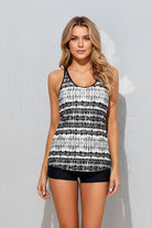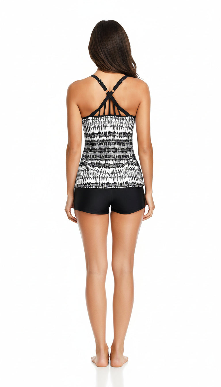 Diseño tipo tankini con escote redondo y caída ligera que aporta comodidad y libertad de movimiento. El top cuenta con una espalda decorativa de tiras cruzadas que ofrece estabilidad y un ajuste moderno. Su corte recto se complementa con shorts suaves que brindan cobertura práctica y firmeza al caminar o nadar. Un modelo pensado para quienes buscan estilo deportivo y confort en una sola pieza.