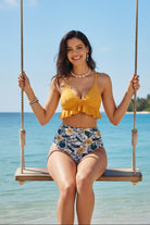 Traje de baño de dos piezas con diseño femenino y favorecedor. La parte superior tipo blusa incorpora tirantes delgados ajustables y un corte bajo el busto que aporta soporte ligero y una caída suave que estiliza la zona media. La parte inferior de tiro alto brinda mayor cobertura y ayuda a definir la silueta, ofreciendo una sensación cómoda y segura al usarlo.