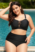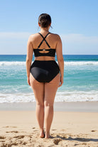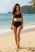 Traje de baño de dos piezas diseñado para brindar soporte, ajuste y seguridad al usarlo. El top cuenta con escote estructurado y detalle de entrecruzado frontal que aporta firmeza y un diseño moderno, además de tirantes ajustables en la espalda que permiten adaptar el calce al cuerpo.