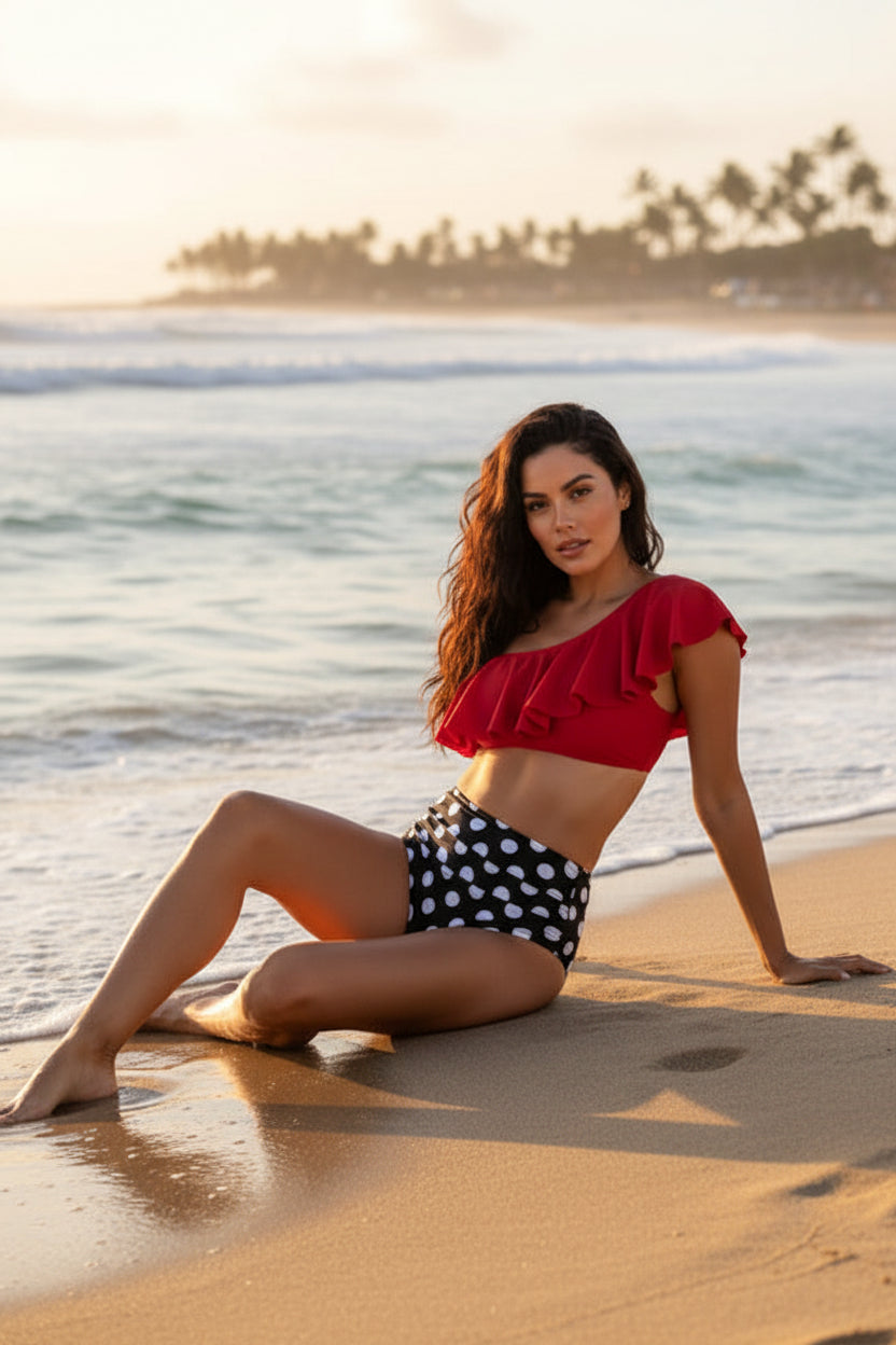 Un traje de baño que combina elegancia y diversión, perfecto para resaltar la personalidad con un aire clásico y sofisticado.