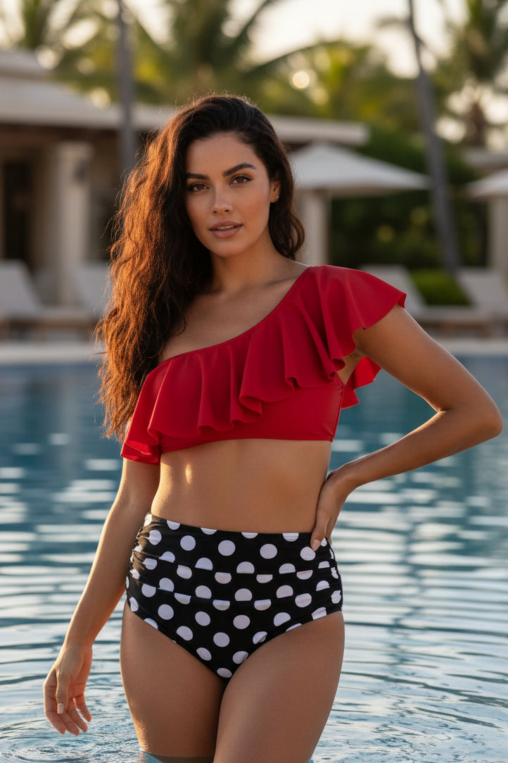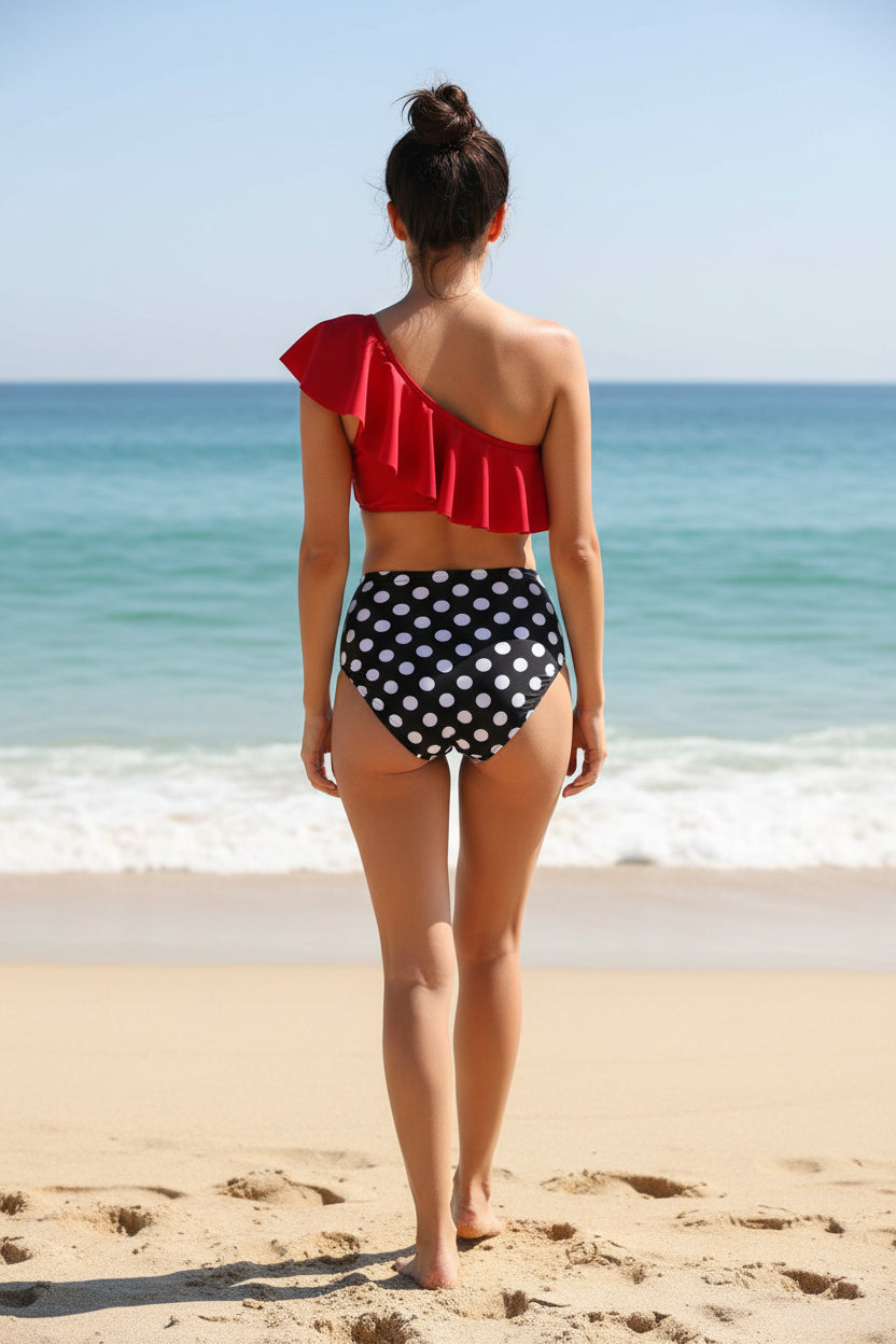 Diseño asimétrico con volado que aporta un toque femenino y original. Su top de un solo hombro brinda un estilo moderno y favorecedor, mientras que la parte inferior de talle alto ofrece comodidad y una silueta estilizada.
