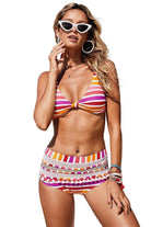 Traje de baño dos piezas, top con nudo frontal que aporta forma y soporte, acompañado de tirantes ajustables que permiten adaptar el ajuste con precisión. La parte inferior de talle alto integra detalles decorativos y un diseño estructurado que brinda cobertura equilibrada y favorece la silueta.