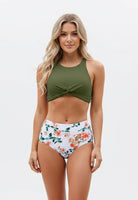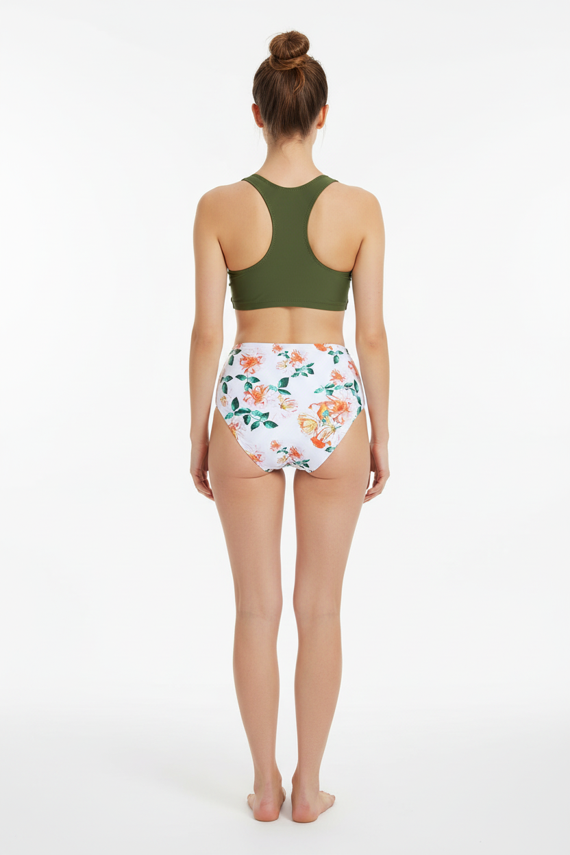 Traje de baño dos piezas, top de corte alto con nudo frontal que aporta estructura y un ajuste firme, complementado con espalda deportiva que ofrece mayor estabilidad y libertad de movimiento. La parte inferior de talle alto brinda una silueta equilibrada y un ajuste cómodo pensado para ofrecer cobertura sin limitar la movilidad.