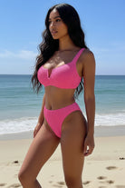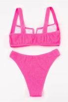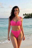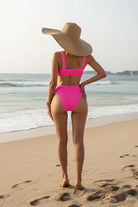 Bikini de dos piezas con textura acanalada y un diseño moderno que realza la silueta. La parte superior cuenta con un escote en V estructurado que aporta un toque elegante y favorecedor, mientras que los tirantes anchos brindan comodidad y un soporte ligero. La parte inferior de tiro alto ayuda a definir la cintura y ofrece un ajuste suave y estilizado. Un conjunto ideal para disfrutar del sol con un look femenino, actual y muy favorecedor.