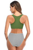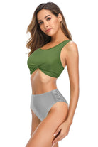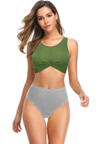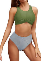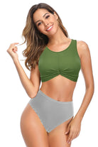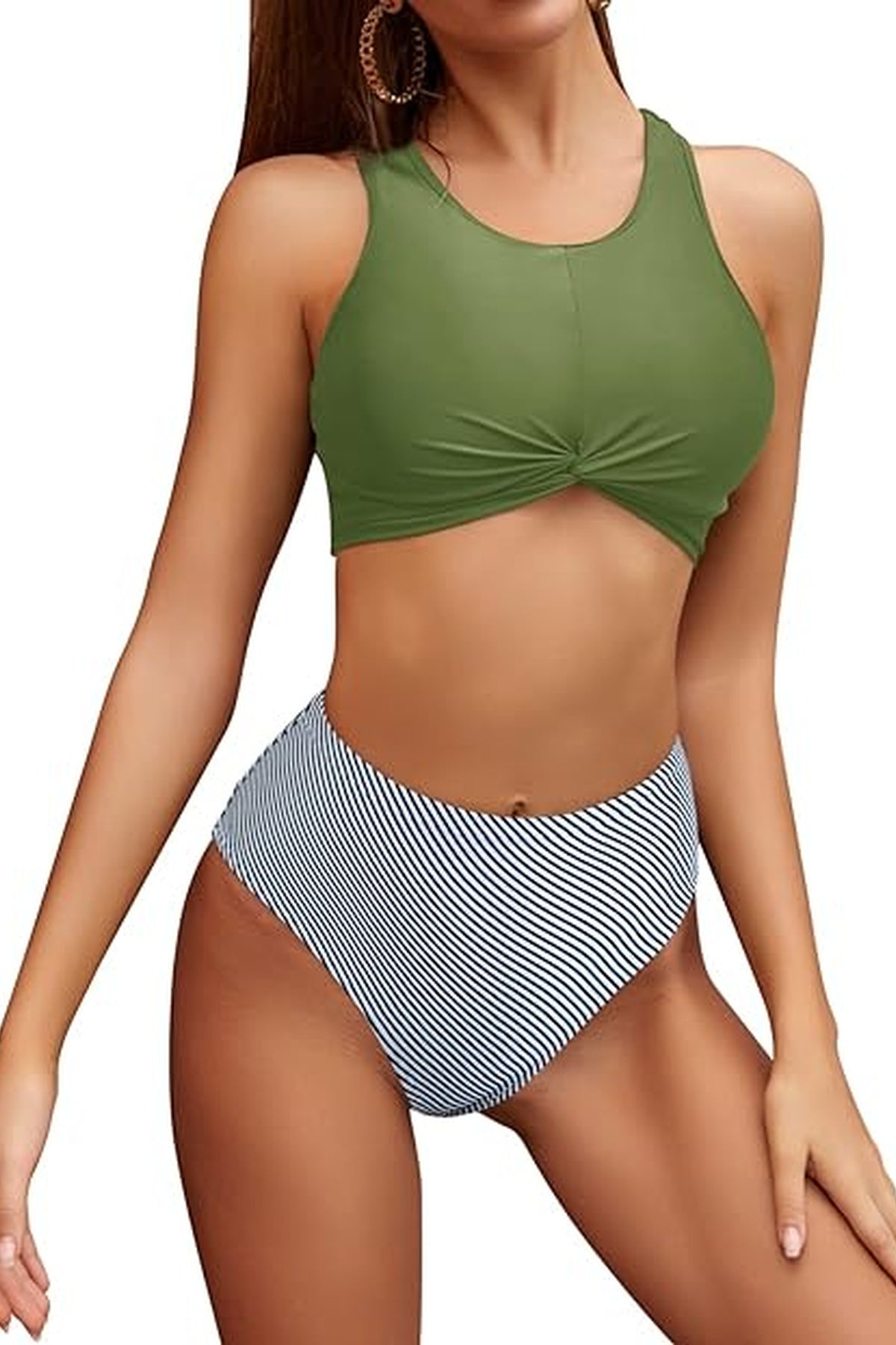 Traje de baño dos piezas, top de corte alto con nudo frontal que aporta estructura y un ajuste firme, complementado con espalda deportiva que brinda soporte y libertad de movimiento. La parte inferior de talle alto estiliza la silueta y ofrece una cobertura equilibrada con un ajuste cómodo que se adapta al cuerpo sin limitar la movilidad.