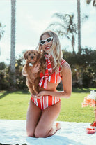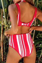 Traje de baño de dos piezas en color rojo con estampado de rayas blancas verticales, ideal para estilizar la figura. El top con tirantes anchos y nudo al frente aporta soporte y un detalle coqueto, además incluye un pañuelo a juego que le da un toque elegante y versátil. La parte inferior de tiro alto realza la cintura y ofrece control visual del abdomen para mayor comodidad y seguridad al lucirlo.