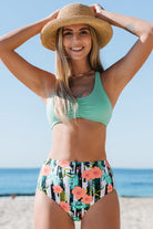 Top en tono verde aqua con tirantes ajustables y detalle de cruce en la espalda que brinda soporte y un look moderno. La parte inferior de cintura alta luce un estampado tropical con flores color coral y hojas en contraste, ideal para un estilo alegre y femenino.