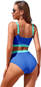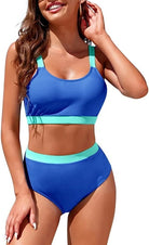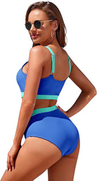 Traje de baño de dos piezas con diseño deportivo, top de tirantes anchos ajustables con detalle de franja en contraste y panty de tiro alto que brinda comodidad y buen soporte.