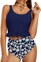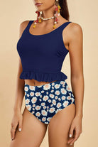 Traje de baño de dos piezas con top de tirantes anchos y detalle de volantes en la parte inferior, acompañado de un diseño con espalda cruzada ajustable. La parte inferior es de corte alto y estampado de flores, ofreciendo un estilo femenino y cómodo.