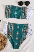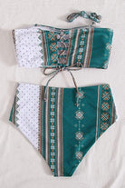 Traje de baño de dos piezas con top tipo bandeau de espalda ajustable y tiras entrecruzadas. La parte inferior de cintura alta brinda un ajuste cómodo y seguro, con estampado étnico geométrico que aporta un estilo moderno y llamativo.