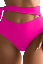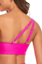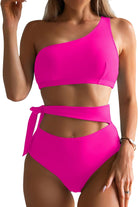 Traje de baño de dos piezas con diseño asimétrico en la parte superior de un solo hombro. Incluye un detalle de amarre lateral que estiliza la cintura y tirantes ajustables en la parte posterior para mayor soporte. La parte inferior es de corte alto, favoreciendo la silueta y brindando comodidad.