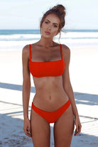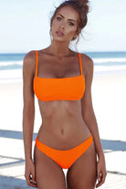 Bikini brasileño con diseño sencillo y moderno. El top de tirantes delgados y escote recto ofrece un ajuste cómodo con cierre en la espalda, mientras que la parte inferior de corte alto estiliza la figura. Su diseño posterior tipo brasileño resalta las curvas con un look fresco y llamativo, perfecto para brillar en la playa o la alberca.