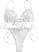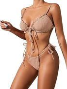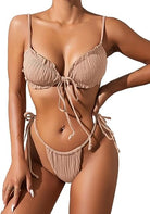 Bikini brasileño en color nude con textura acanalada que aporta un estilo moderno y elegante. El top con copas ajustables y tiras al frente brinda soporte y realce natural, mientras que la parte inferior de amarre lateral se adapta perfectamente a la silueta. Su diseño posterior tipo brasileño resalta las curvas con un toque sofisticado y atrevido.