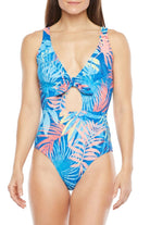 Traje de baño de una pieza con estampado tropical en tonos azul, coral y amarillo. Su diseño con escote en V profundo y detalle de nudo al frente con abertura aporta un toque moderno y favorecedor. Con corte ajustado que realza la figura, es ideal para lucir con frescura y estilo en la playa o la alberca.