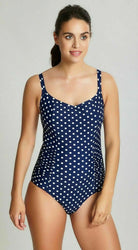 Traje de baño de una pieza en color azul marino con estampado de lunares blancos. Su diseño clásico con escote suave y tirantes anchos ajustables ofrece soporte y comodidad. Incluye detalle de fruncido lateral que favorece la silueta y un pequeño corte en la espalda con cierre para un ajuste seguro. Un estilo atemporal que combina elegancia y frescura para la playa o la alberca.