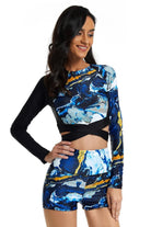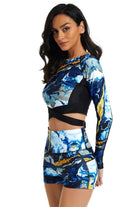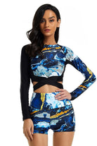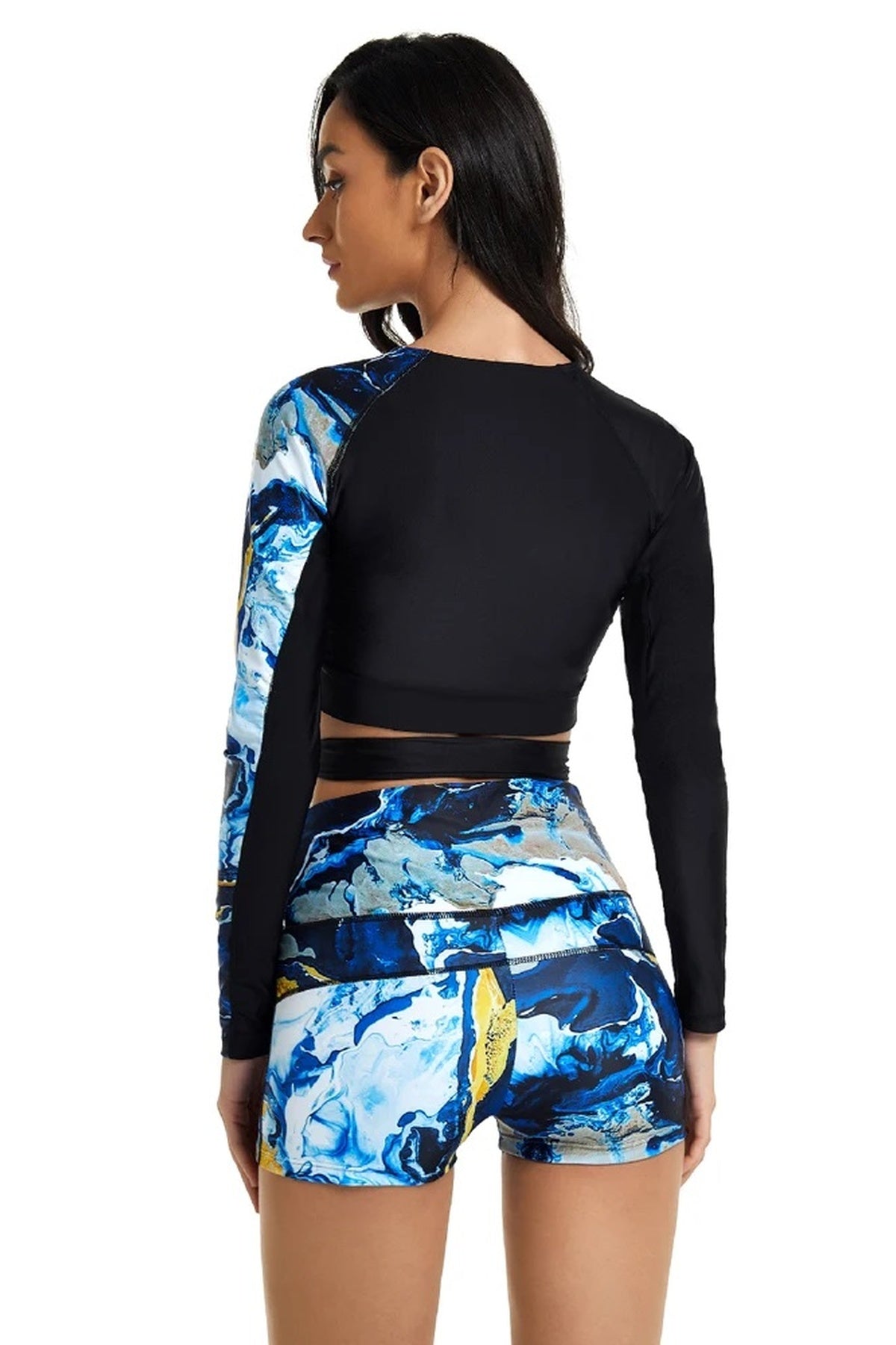 Traje de baño deportivo de mujer conjunto diseñado para brindarte comodidad y seguridad en cada movimiento. Su estilo de manga larga y short ofrece mayor cobertura y libertad, ideal para nadar, caminar junto al mar o disfrutar actividades al aire libre. El diseño combina una parte superior ajustada con detalle cruzado y un short de tiro alto que aporta soporte y libertad. Un modelo pensado para mujeres que buscan estilo y funcionalidad en una sola pieza.