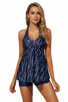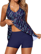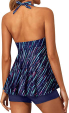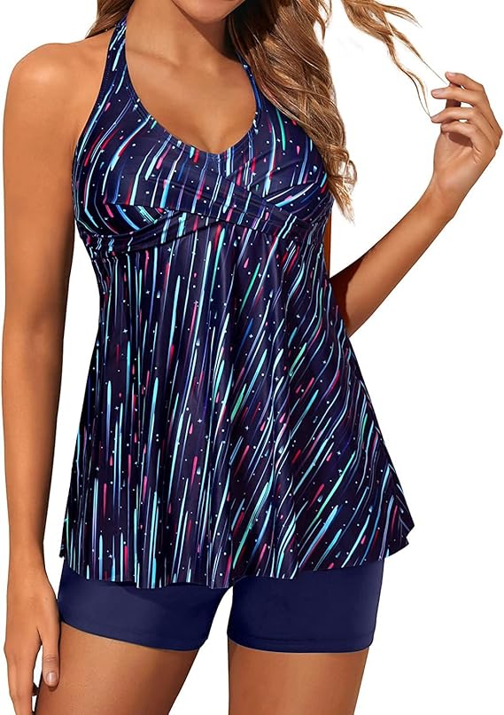 Traje de baño tipo tankini con top de estilo halter que brinda soporte suave y una caída amplia que aporta comodidad y libertad de movimiento. El diseño incorpora una parte superior fluida que favorece la silueta, con un ajuste adaptable en el cuello para mayor seguridad. La parte inferior tipo short ofrece cobertura adicional y un ajuste firme que permite disfrutar cualquier actividad dentro o fuera del agua.