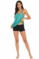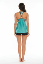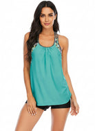 Diseño tipo tankini con escote redondo y un ajuste suave en el pecho que brinda comodidad al moverte. Los tirantes estilo racerback ofrecen soporte estable y un toque moderno, mientras que el top fluido mantiene una caída ligera y favorecedora. Se complementa con shorts prácticos que aportan libertad, seguridad y un look fresco para disfrutar de cualquier actividad acuática.