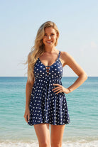 Traje de baño tipo vestido de una pieza con diseño femenino y favorecedor. Cuenta con escote en V con detalle de tiras al frente que aporta soporte y un toque visual estilizado. Su corte bajo el busto ayuda a definir la silueta, mientras que la falda fluida brinda cobertura ligera y movimiento natural.