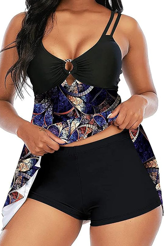Traje de baño de 2 piezas short con estilo tipo vestido y caída ligera. La parte superior ofrece buen soporte gracias a sus tirantes dobles ajustables y un detalle central que realza la forma del busto. La parte baja amplia con corte asimétrico aporta movimiento, comodidad y mayor cobertura, manteniendo un look femenino y favorecedor. Una opción ideal para disfrutar con confianza en cualquier plan cerca del agua.